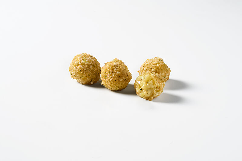 Comfort-Food trifft Haute Cuisine: Italienische Pasta in einer Käsefüllung aus Mature Cheddar, Mozzarella und Frischkäse, durchzogen von Trüffelöl und echten schwarzen Sommertrüffeln. 20 g pures Genusserlebnis im Fingerfoodformat.